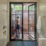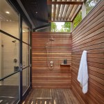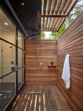 The theme continued to their new master bathroom, where the designers chose to have the indoor shower open directly to the outdoor shower. A 6-foot-wide, 9-foot-tall aluminum clad door welcomes users to the 60-square-foot outdoor bathing area. Ipe walls and a louvered trellis screen views from neighboring properties while allowing the area to flood with natural light. Stationary and handheld stainless steel fixtures finish off the exterior, while porcelain tile walls and floors complete the interior.