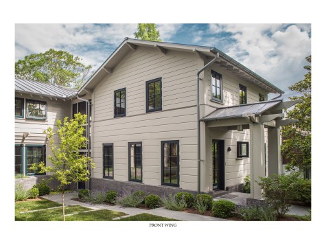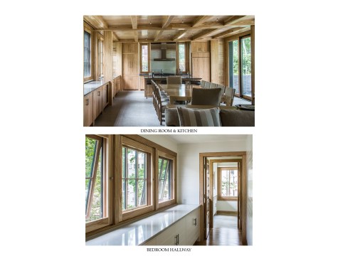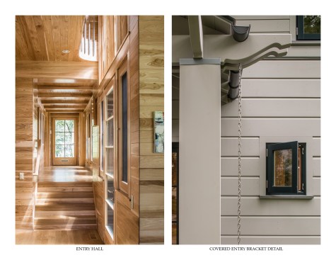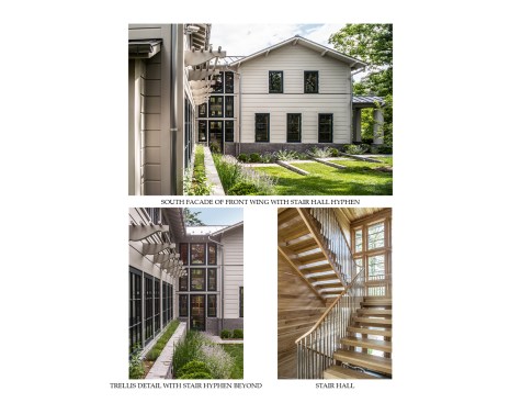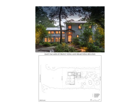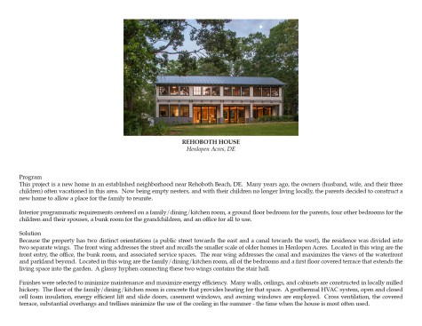 Program This project is a new home in an established neighborhood near Rehoboth Beach, DE. Many years ago, the owners (husband, wife, and their three children) often vacationed in this area. Now being empty nesters, and with their children no longer living locally, the parents decided to construct a new home to allow a place for the family to reunite. Interior programmatic requirements centered on a family/dining/kitchen room, a ground floor bedroom for the parents, four other bedrooms for the children and their spouses, a bunk room for the grandchildren, and an office for all to use. Solution Because the property has two distinct orientations (a public street towards the east and a canal towards the west), the residence was divided into two separate wings. The front wing addresses the street and recalls the smaller scale of older homes in Henlopen Acres. Located in this wing are the front entry, the office, the bunk room, and associated service spaces. The rear wing addresses the canal and maximizes the views of the waterfront and parkland beyond. Located in this wing are the family/dining/kitchen room, all of the bedrooms and a first floor covered terrace that extends the living space into the garden. A glassy hyphen connecting these two wings contains the stair hall. Finishes were selected to minimize maintenance and maximize energy efficiency. Many walls, ceilings, and cabinets are constructed in locally milled hickory. The floor of the family/dining/kitchen room is concrete that provides heating for that space. A geothermal HVAC system, open and closed cell foam insulation, energy efficient lift and slide doors, casement windows, and awning windows are employed. Cross ventilation, the covered terrace, substantial overhangs and trellises minimize the use of the cooling in the summer – the time when the house is most often used.