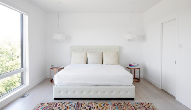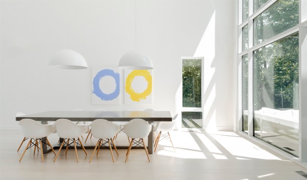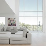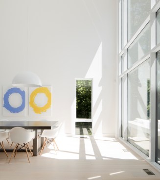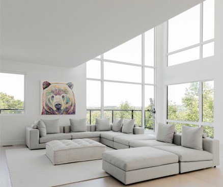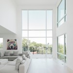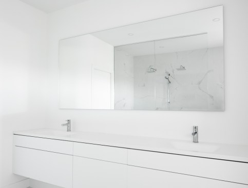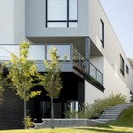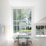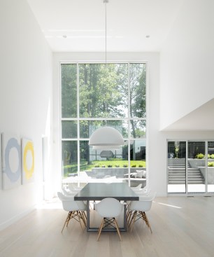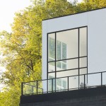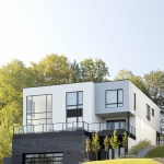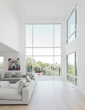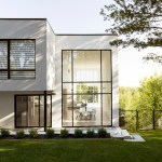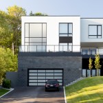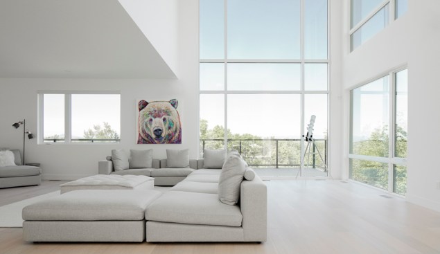 This residential project has been realized for a young family, whose father is a professional hockey player. Our mandate was to design a contemporary, minimalist home, with large black windows and white acrylic coating, on a sloping ground offering incredible views of the Parc des Laurentides.