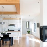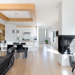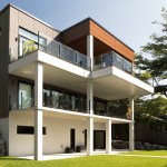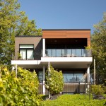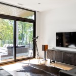 The front facade being more closed, it is on the way home that we are welcomed in a majestic hall that connects all levels and connects visually to the river. Each level has a full-width outdoor balcony and the handrail-free glass railings offer total visibility.