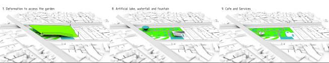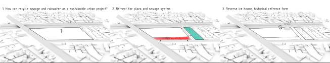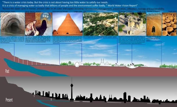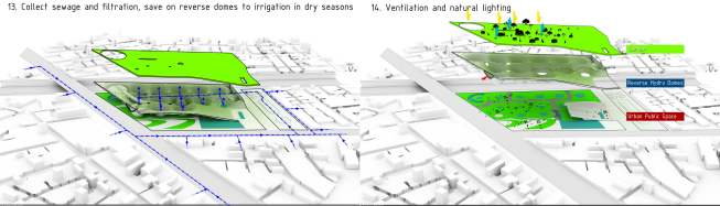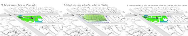 To address all these issues, the history of water handling, has been studied and by integrating history, culture, ecology, sustainability and awareness of pre-modern nostalgia, a new typology has evolved with a contemporary language. The project offers a set of sustainable solutions for reactivating the area, transforming waste water for irrigation and rain water in the way that is pleasant for humans by reverse domes with a capacity of 124.400 cubic meters to save water in the rainy season and use in the dry season. This process cause preventing the contamination of groundwater, regulate water management , regulate interactions between the city and the environment, enhance the quality of urban space, minimize co2 emission and regulate temperature by a single gigantic structure which covers public spaces and water reservoirs under a massive urban green roof with the aspects of sustainability and ecology in order to the benefit of social and environment. The design gives solid form to deep questions about society, sustainability and, of course, architecture itself.