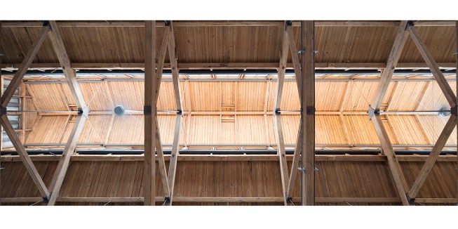 – Roof trusses were restored, reinforced and tensioned; purlins, structural decking replaced, sandblasted to expose the Douglas Fir.