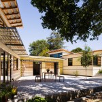 Two shed-roofed volumes, oriented and shaped for passive and active solar, are linked to create a private courtyard. Designed to receive afternoon shade from a stand of mature oaks, the courtyard opens to a hillside meadow and upper pool terrace with vegetable garden.