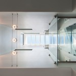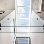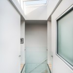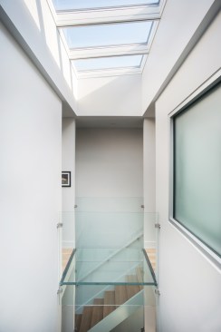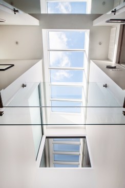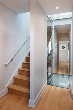 The urban row house is a taut 20′x48′ rectangular box on three levels with a centrally located sky lit light-well inside that bathes the heart of the house with light. The light-well bisects the plan and cross section front to back symmetrically. Transparent glass bridges span the three story vertical shaft of light connecting four bedroom suites to the stair hall. A projecting glass and metal window bay on the front facade was inspired by the bay windows that punctuate many of the historic houses on the street. Ground floor black steel and iron porch details, light brick, and a solid mahogany entry door complete the expression with a nod to its place in the city, but also its place in time. The design received unanimous approval by the Richmond Commission of Architectural Review. The guidelines are similar to the standards set by the Secretary of the Interior, in which new construction shall be clearly discernible from the historic, but relate in materials, massing, and form.