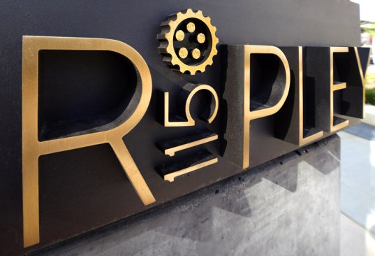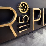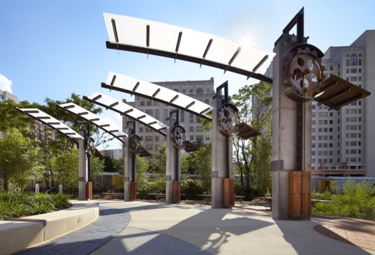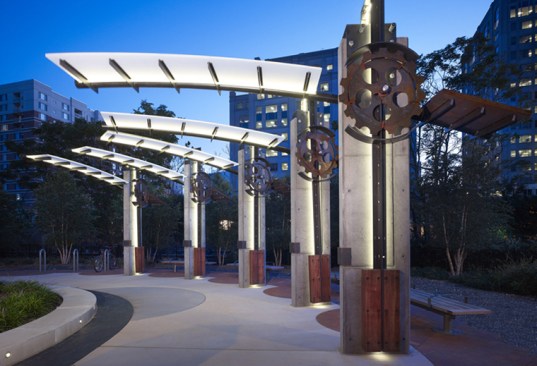 The cog makes reference to industry, railroad and bicycling, and symbolizes motion. CNC plazma cut and hand assembled, this industrial relic has been used throughout the site installation and reinforces the branding of the plaza.