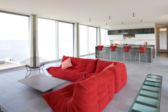 The long and slender house is comprised of nine-and-one-half 12’ x 22’ structural steel bays (8 bays of interior space and 1.5 bays of screened porch) sitting on poured concrete foundation walls which were left partially exposed due to the steeply sloping site. By divorcing the primary skin of the house from the steel structure, large sliding glass doors could be used as the only barrier between interior and exterior. As a result, all interior spaces offer uninterrupted views out to the river.