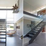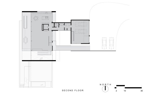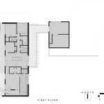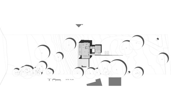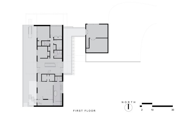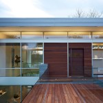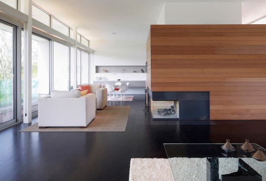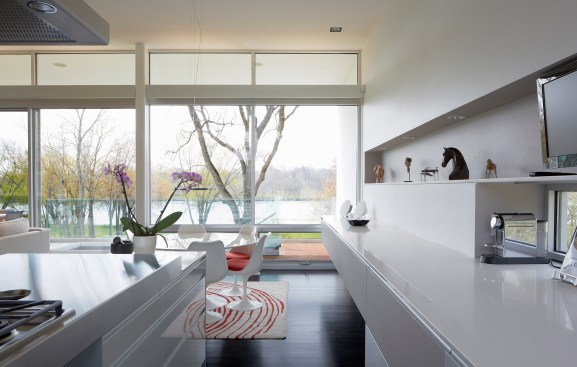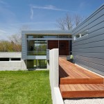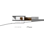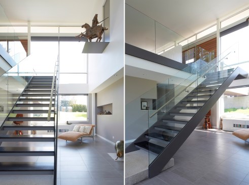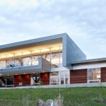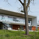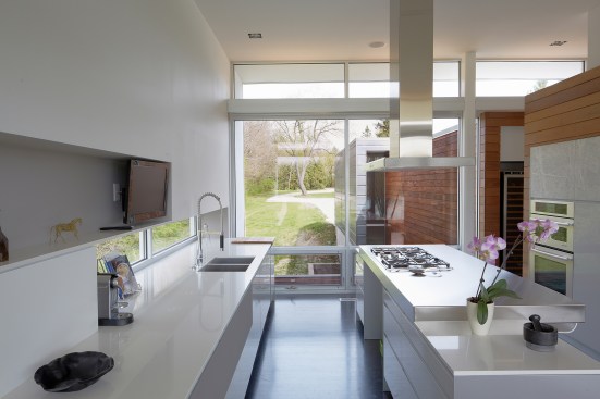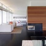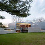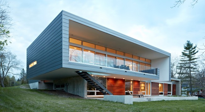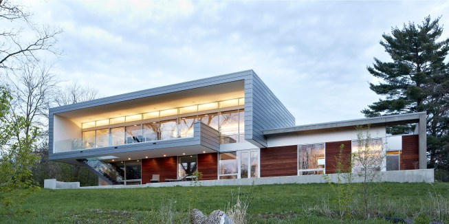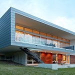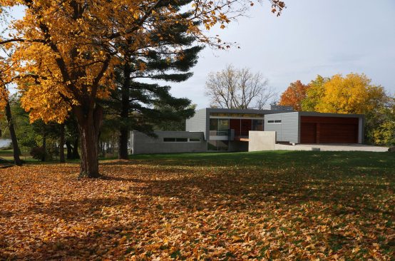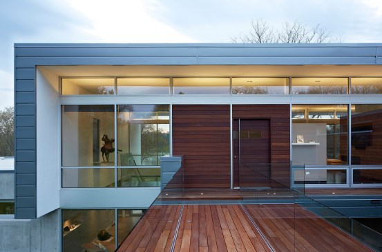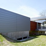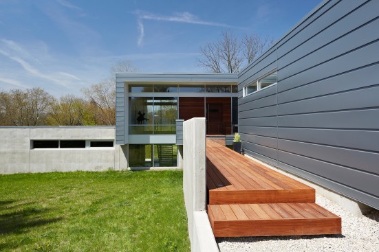 The program called for a house that responded to its site with a compact footprint as well a design that framed views of the natural-grassed sloped terrain down to the Fox River, not only from within the residence, but through the exterior. The traditional residential arrangement of public and private spaces was inverted, which allowed for transparency through the house and spectacular elevated views from the upper level. The upper level has an expansive cantilevered terrace and a roof suspended over the lower level, which shades the south and west side during times of high sun exposure. The lower bedroom level is nestled in the sloping earth, providing privacy security, and an intimate connection to the site. To minimize the footprint on the site, the house and garage are physically separated and then connected by a suspended tube element that is clad in ipe wood. This enclosed tube is the only structure on the upper level and it houses the fireplace, pantry, and kitchen components. Adjacent to this enclosed tube is an open glass-lined bridge similarly clad in ipe that floats visitors from the landscape to the front door. The exterior consists of a simple and modern palette of sustainable and highly durable materials. The base is exposed concrete, the upper level clad in charcoal anodized aluminum panels, and both use accents of ipe wood to provide visual balance. The interior finishes include stained walnut flooring, ipe, glass railings, and exposed steel stairs that descend into a 2-story light filled art gallery. The master bath is bathed in natural light, which pours in from several discrete sources that reflect off of the tiled floors and the partial height exposed concrete wall that separates the bedroom and bathroom.