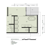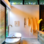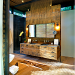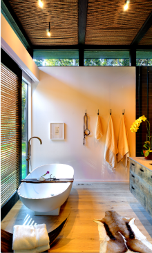 Exposing lighting and shielding utilities was a top priority for the bath. The solution, rope woven between the existing ceiling joists, was inspired by one of the homeowner’s prized possessions, a mid-century woven chair by Danish furniture designer Hans Wegner. The rope covering on the ceiling adds hand-hewn appeal; that same rope is used to hang the custom mirror at the vanity, and as a screen on the master bath’s sliding doors. A vanity made of salvage wood underscores the hand-crafted appeal of a bath that serves as a private haven.