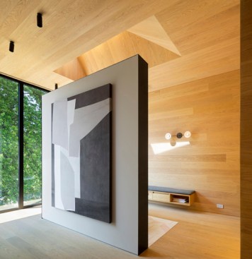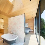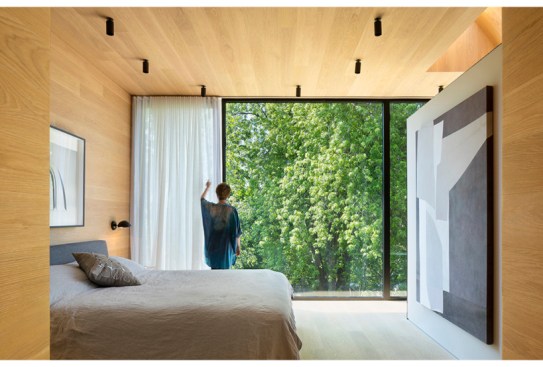 Aptly dubbed the Room With a View, the heart of this Toronto home’s renovation is located in its master en suite bath—which local architectural firm Superkül designed as a serene escape from daily life. An oversized, south-facing window stretches across the room’s pale oak surfaces and pulls the tree-lined landscapes in, washing the space in greenery and sunlight in the warmer months, and blankets of snow in winter. Handmade Moroccan tiles in muted blush hues are arranged in an abstract geometric pattern, lining the floor beneath the freestanding tub and the “privacy wall,” which delineates the bathing area from the bedroom. Charcoal trim, steel window frames, and matte black fixtures add visual contrast to the subdued palette. Above the bathtub, a sculptural, asymmetric skylight further enhances the connection to the natural environment and invites patterns of sunlight and shadows to shift across the space. —Leah Demirjian