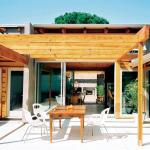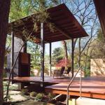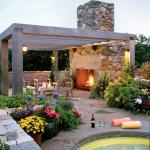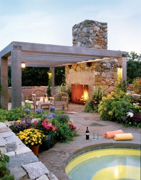 This rustic loggia bookends the pool deck between the main and guest houses on a Martha’s Vineyard, Mass., estate (right). Both buildings shield the space from brisk winds but are far enough away to let the sun warm the space throughout the day. An imposing fireplace made from local stones caps the corner nook while a simple trellis sets it apart from the rest of the fully exposed terrace. Eventually, vines will cover the cedar trellis, creating a green ceiling and more shade. Enhancing the cozy quotient, stone armatures lined with cedar benches extend from the chimney. “Just because you’re outside doesn’t mean you can forget the elements of making a good room,” summarizes architect Mark Hutker.