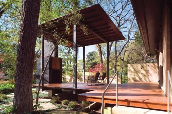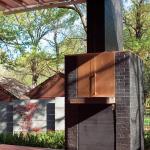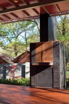 A 40-pound copper door provides additional heat control; the counterweights that operate it are a nod to Texas’ famous barbecue pits. The chimney helps support a steel-framed canopy that shades the 16-foot-by-16-foot porch. For the canopy, Shipley speced an off-the-shelf plywood product intended for making concrete forms. “The underside is a slick red surface that you can leave exposed,” he says. IpĂ© decking hovers close enough to the ground to forgo guard rails, so guests can dangle their legs over the edges while waiting for their slice.
