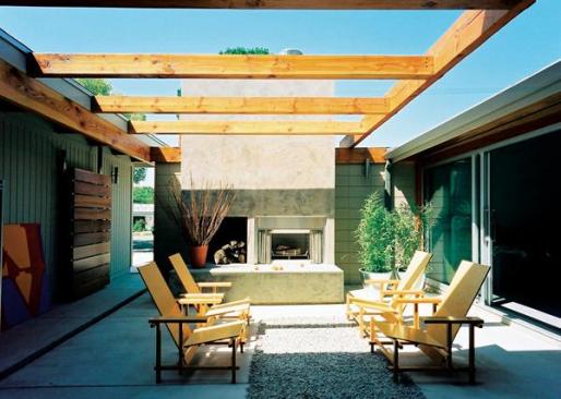 Adding a dining room to this California Ranch produced a fully enclosed courtyard between the house and the formerly detached garage. An existing concrete block wall that runs along the front yard made an interesting focal point for the outdoor living room. “We loved this wall and really wanted to make use of it,” says architect Ruth Hasell, “but empty walls often become de facto storage, so we put the fireplace there.”