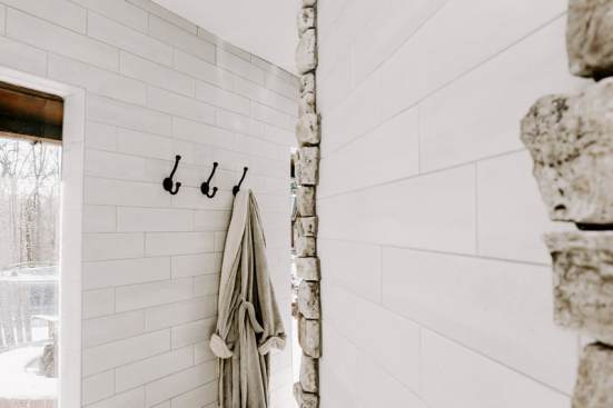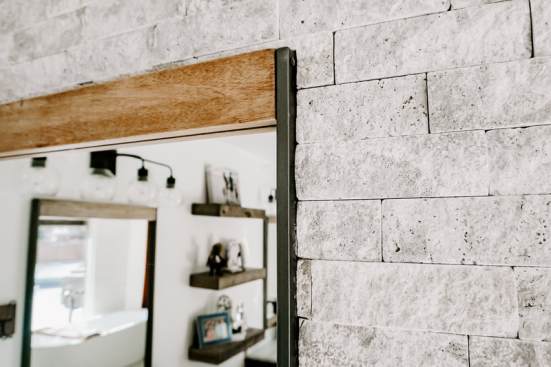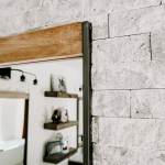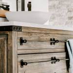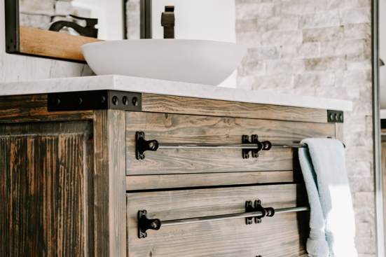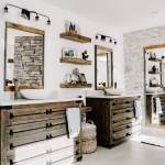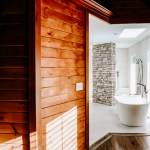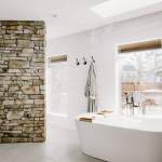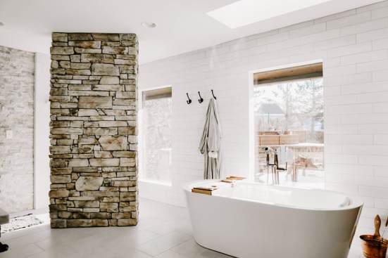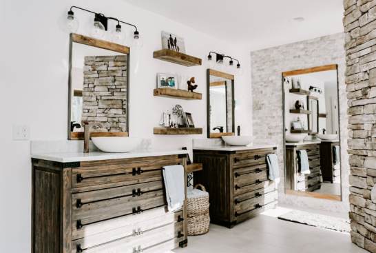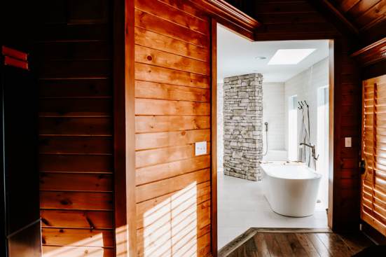 RedesignKC's bathroom renovation resulted in a beautiful space. The bathroom is unique due to the open nature of the space – connecting directly with the master bedroom with no doors to divide areas. The contrast of the dark wood in the master bedroom and the bright natural tones of the bathroom creates a beautiful and unique moment. The walk-in shower is tucked behind a substantial stone wall and is perfectly detailed. The freestanding tub centers on a large picture window with a skylight above. The twin vanities add a wood tone with a soft texture of the concrete vessel sinks. The clean and bright tile with a mix of cool stone textures, minimalist white fixtures, and rustic, warm wood accents were some highlights of this transformation.. This master bathroom is the perfect vision of a rustic, modern spa that enhances functionality.