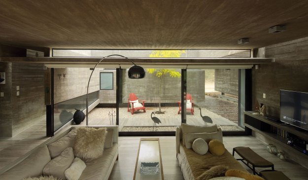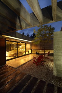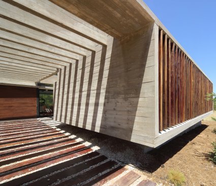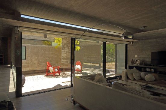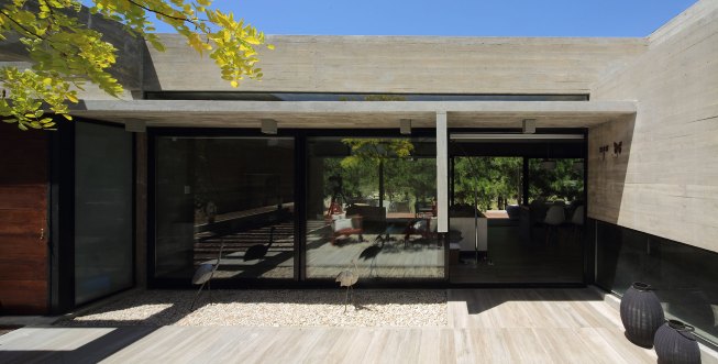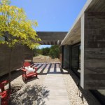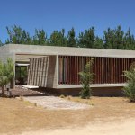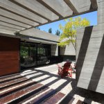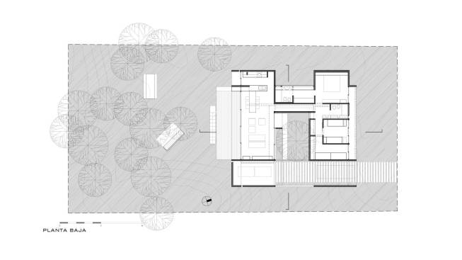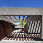 The most private sector of the house is located in the front that is protected from the NW sun and from the street views by a structure of Quebracho sleepers, placed upright and with a random rhythm. The social sector and the terrace expansion are located in direct relation to the trees that occupies the entire back of the lot, but also in contact with the entrance courtyard. This space becomes protagonist of the proposal for its strategic location and the spatial richness that adds the pergola with different sets of lights and shadows that the sun’s path generates throughout the day.