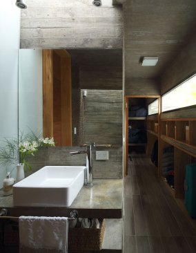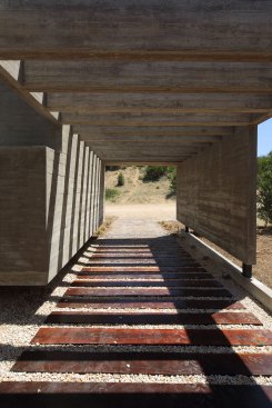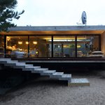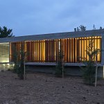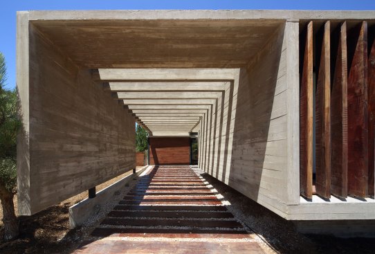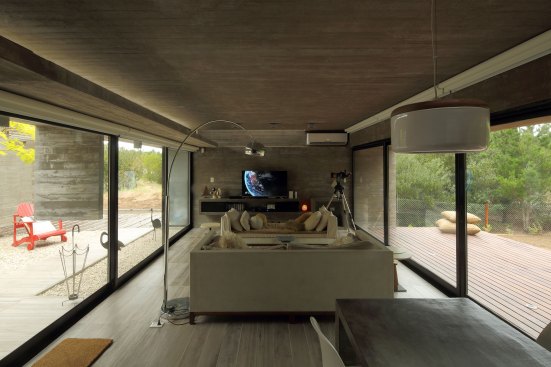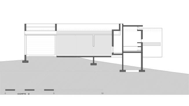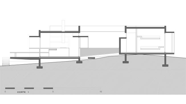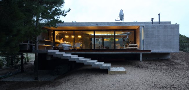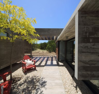 The house appears as a single volume pierced by a courtyard that actually hides an organization into two distinct sectors by its use and, to accommodate to the dune, they are placed with a difference of 0.45 m concealed abroad at the height of the perimeter beams. These two sectors are connected by a smooth ramp that crosses the divide and by a concrete pergola with a strong presence.