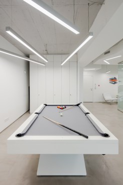 Being a company based on creativity and the development of new ideas, based on an exchange of knowledge of its employees and still looking for new solutions, it was thought a play area that could provide a relaxed environment in which it was implemented a snooker table and ping pong. This table also allows the possibility of turning into a work table of a larger size than the one in the meeting room, and for see big drawings in papper.