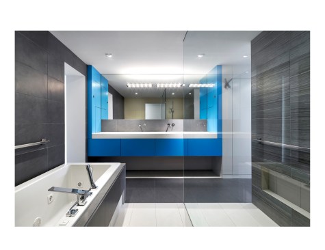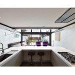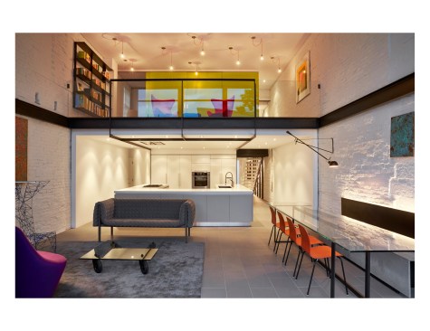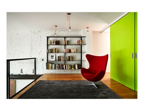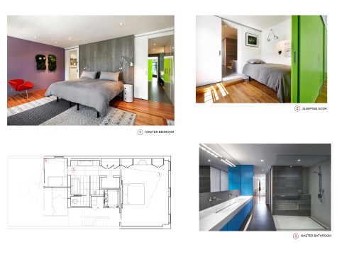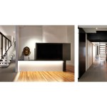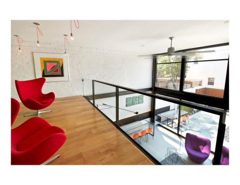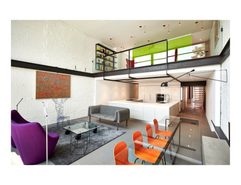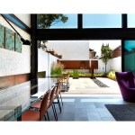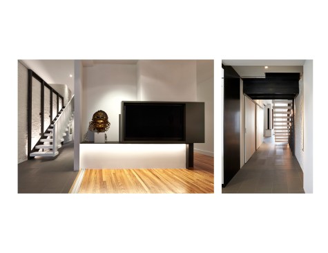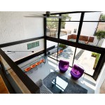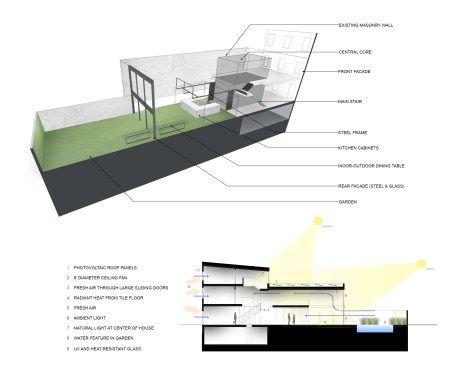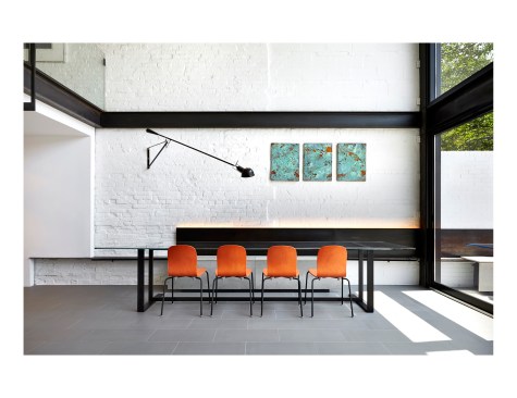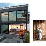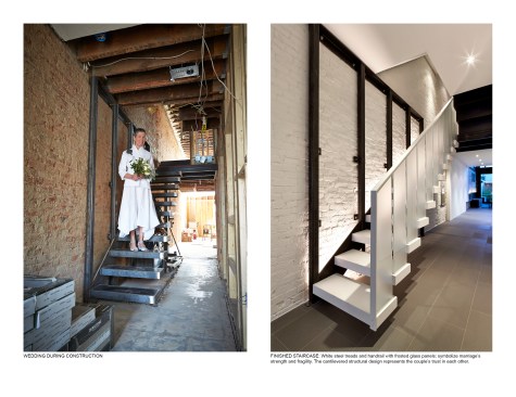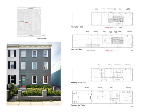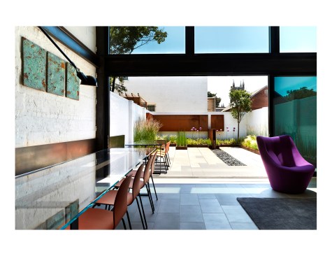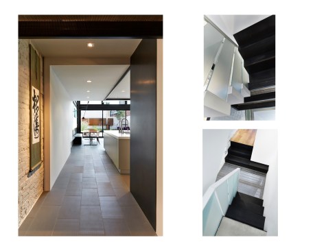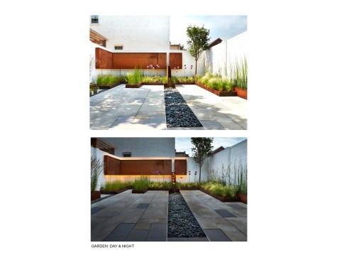Salt and Pepper House The Owners, a couple in their mid-70’s, purchased this home to start their lives together. They got engaged after they bought the house, and got married in the house while it was under construction. They love to cook and collect art, so the palette of white walls and black steel is both a metaphor for salt and pepper, as well as a setting for framing their artwork. Pops of color highlight the colors in their art collection. The house is organized around a central core containing service spaces, which creates a seamless flow along the perimeter, with major spaces facing front and back. The existing house was stripped down to its basic elements: brick walls, structural framing members, and outdoor space. The rear second floor was removed to create a two-story living/dining room facing the rear garden. Steel structure was inserted to allow for a full glass wall to the rear. The kitchen sits at the center of the house facing the garden, and an indoor-outdoor dining table with bench (both custom-designed by the architect) create a strong interdependence of cooking, eating, and enjoying the outdoor space. A Corten steel fountain provides the calming sound of water. Aging in place was an important design factor. An elevator is concealed within the central core, and all circulation routes are wide enough for a wheelchair. The master bathroom has custom stainless grab bars and an open shower for roll-in access.