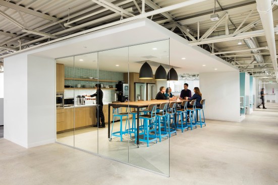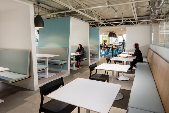 In addition to the ample meeting spaces we wanted to provided several informal areas for staff to gather including a cafe and a kitchen. The kitchen has a long built-in bench with tables suitable for both dining and informal meeting. In the open café space, we provided a large communal table intended to encourage staff socialization. In addition, we added banquettes that provide space for 4-6 people to dine or meet over lunch.