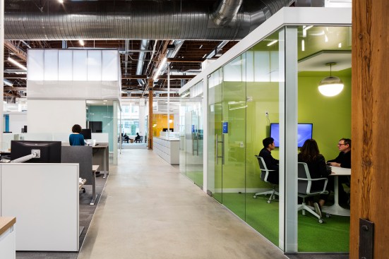 To offset the loss of personal private space we introduced a series huddle rooms sufficient in size for meetings of 4-6 people. We also added soundproof phone booths for private calls and/or video chats. We paired the huddle rooms together and spread those pods out on the floor to create defined work areas between them. This helped to break up the space and create smaller neighborhoods with one or several departments in each. We dubbed the final plan layout our “Village” scheme where the huddle pods were buildings and the open office areas between them were open neighborhood plazas.