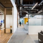 In response to a need for a meeting space large enough for the entire staff to meet, we created a flexible open space at the main entrance where staff can mingle as they come and go from the office. We turned a required stair up to the existing mezzanine into a seating platform that could be used for as an “all-hands” meeting space.