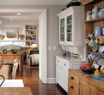 The designers used symmetry and proportion to let individual details shine while preventing them from being too much. An antique pine hutch, for instance, is the focus of one wall and was the inspiration for the furniture-like cabinetry. Similar dimensions and details tie the pieces together. Painting the built-in millwork white allows the hutch to stand out while it unifies the room as a whole.