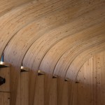 The arena interior is all wood. Glue laminated arches support structural planking. Above the insulation, a skin of color coated standing seam metal covers the roof and walls. Careful detailing on seams and windows creates a taut box with textured and lively surfaces.