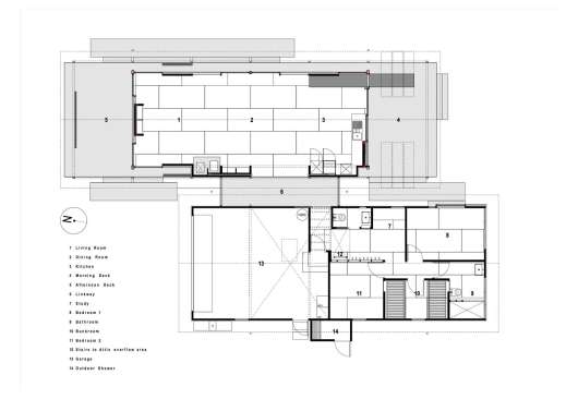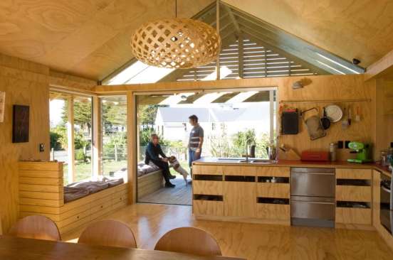 Shoal Bay is a remote settlement on the rugged east coast of southern Hawkes Bay. The building is designed to be part of the rural setting, it is raised off the ground and sits beside the original woolshed, which has served the bay since the early 1900’s. The bach is rugged yet welcoming and offers unpretentious shelter, it is the type of place where you kick off your shoes and don’t need to worry whether you walk sand through the house.The bach is formed of two slightly off-set pavilions, one housing the bedrooms and the other the main living space. Decks are located at each end of the living pavilion allowing the sun to be followed throughout the day. Sliding screens at the north-west end provide adjustable shelter for the different wind conditions, offer privacy from neighbouring campers and act as walls for outside sleeping.