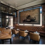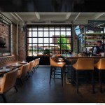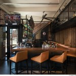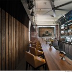 The interior boasts a juxtaposition of raw wood with the industrial aesthetic of the building. Black oxide metal finishes are used on all steel components, including the space-saving overhead wine racks accessed by a rolling ladder, and the edge-lit shelving at the bar-back.