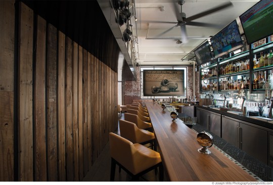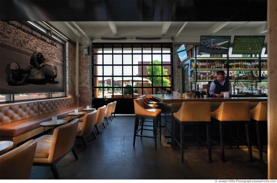 A digitally-manipulated vintage photograph of sidecar racers provides a focal point at the end of the bar and also acts as a shade in the large historic window.