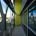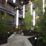 The project also tested the cost effectiveness of photovoltaic systems, a rooftop solar hot water system, drought-tolerant landscaping, a computer-controlled irrigation system, environmentally friendly building materials, and Energy Star appliances. Passive solar strategies generate power for all of the building’s common areas, and a second system of rooftop solar panels provides hot water for the entire building. The east-west building orientation and north- and south-facing windows maximize daylight and minimize solar gain.