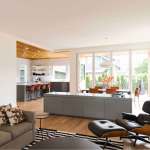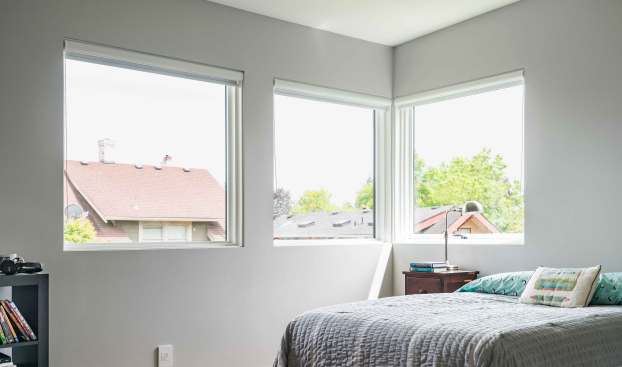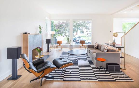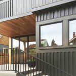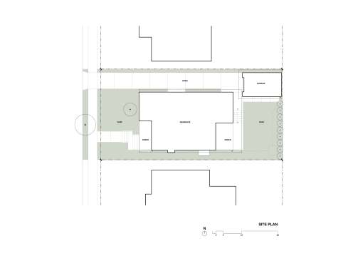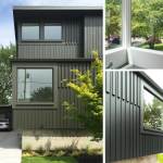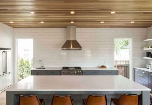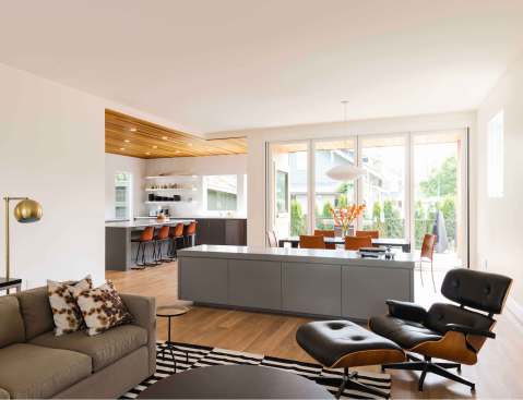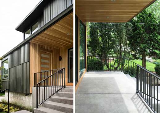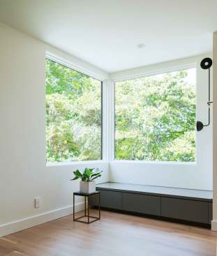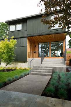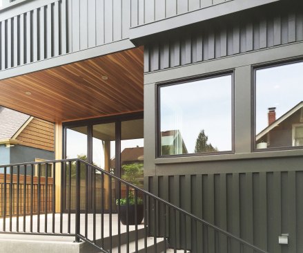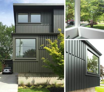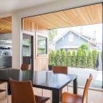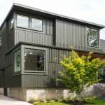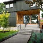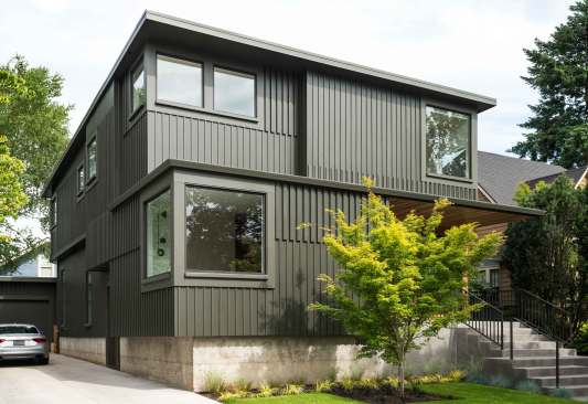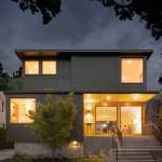 Siskiyou House is a new residence located in the classic Alameda-Beaumont neighborhood of Northeast Portland. Built for a family relocated from the Midwest, the 4,000 sq ft house continues a dialogue with the historic character of the neighborhood with a design sensitive to the clients’ modern vision. Siskiyou House offsets bold gestures with subtle details, balances openness and privacy, and maximizes daylight to create interior expansiveness within the parameters of a city infill lot. The initial challenge involved integrating a contemporary design within an established neighborhood. The Alameda-Beaumont district is pedestrian oriented with eclectic post-war wood-framed houses lining both sides of the street. Siskiyou House aimed to preserve and reinforce the flow of open space along the street by continuing the front and side setback patterns of the neighborhood. A generous, welcoming entrance set at 4 feet above grade, featuring a thin column-free cantilevered roof, is congruent with the neighborhood’s pattern of raised porches. The material selection of exterior cladding is also contextual and composed of readily available milled sizes, including 1×8 v-groove cedar siding, and 1×2 and 2×4’s as battens. Combinations of repeating components create clean, defined zones of varying density and pattern. The facade also addresses the challenge of managing the size and bulk of a large infill house per the clients’ desires. The discreet quadrants of the facade shift in and out, breaking up expanses of exterior walls. Windows on both levels are placed tightly at the corners, relieving solidity. Siding patterns bring a refined, crisp suggestion of spaces and a delicate scale. Balancing access and privacy, the voluminous interior spaces are offset to allow the sequence of spaces to unfold gradually after entering. The recurring pattern of corner windows begins in the entry foyer — where 6’x6’ windows are placed to bring in multi-directional natural light while drawing the eye diagonally, enhancing a sense of spaciousness and continuity between inside and out. The foyer, living, dining and kitchen flow together in a zig zag of day-lit volumes connecting the front porch to the back of house. The main living space features 8’ twin windows facing the street while smaller operable corner windows bring ventilation and daylight into the space. The accordion glass wall of dining room connects to the back porch and when open allows the outdoor dining room to merge with the indoor dining room. Taking advantage of the views from Alameda ridge, the fixed picture windows of each level are scaled to city views, framing previously un-captured views of downtown Portland’s skyline and the West Hills.