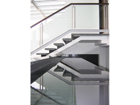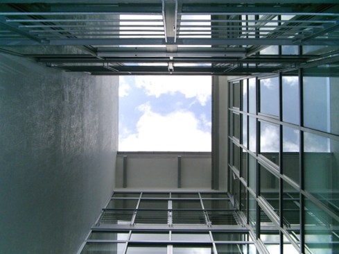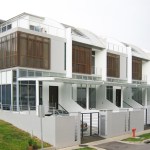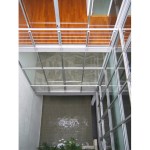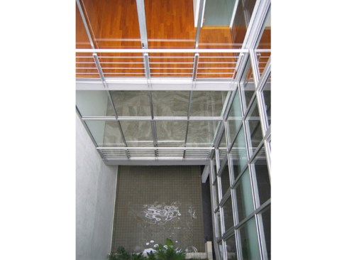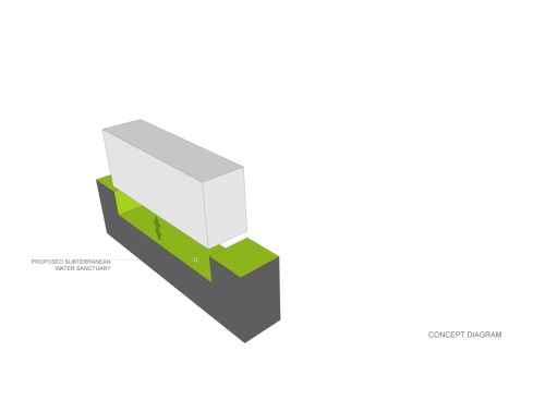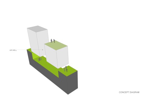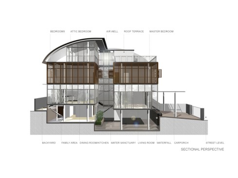 To create a more substantial landscape experience for each house, the building mass is elevated slightly off the ground for a subterranean water sanctuary to integrate the front car porch and backyard into a continuous landscape surface. The air well that punctuates the building mass enables every interior space to connect visually and acoustically to the view and sound of the water feature, thereby bringing the landscape experience into the house interior.
