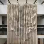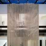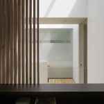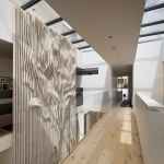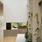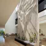 The main hallmark of the atrium is a sculptural wall made of carved wood slats that filters and directs light through the adjoining spaces. A glass-lined transverse bridge connects the bedroom suites on either side of the atrium on the top floor. At the base of the open space, a planter grows vines that will continue to climb the sculptural wall over time.