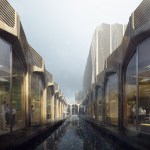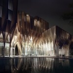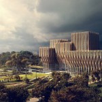The institute’s design is organized as five wooden structures that are separate volumes at ground level, but interweave and link together as they rise upwards; connecting the different departments, visitors, students and staff within a singular whole. With an overall footprint of 80m x 30m at the base and 88m x 38m at roof level, the structures range between three to eight storeys.
