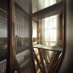 Above the entry atrium, the Institute houses the Documentation Centre archive, with offices for researchers and Institute administration on the top levels. A bridge is suspended above the atrium to connect the school and library.