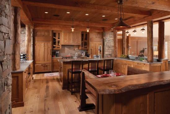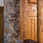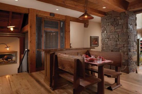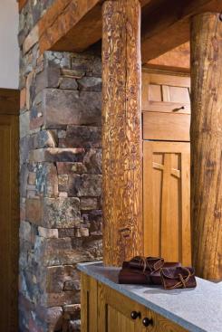 It’s hard to capture the grandeur of big sky country inside a dwelling, but this rustic kitchen does so pretty effectively. Designed for large family gatherings, the open cooking and entertainment space speaks with a distinct mountain accent. The stiles in its custom oak cabinets and doors are asymmetrically carved to look like tree branches, or “to reflect the fluid movement of blowing snow and rushing mountain streams,” according to builder James Murphy of Continental Construction. The rugged topography of this part of the country is similarly reflected in rough-hewn stone walls, timber columns, a brawny granite countertop with irregular edges, and reclaimed old-growth oak floors, which were locally sourced.