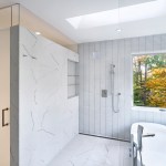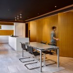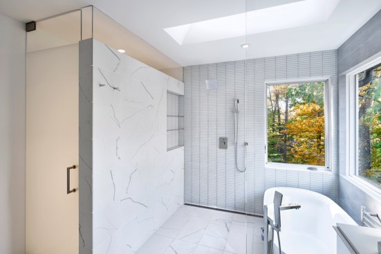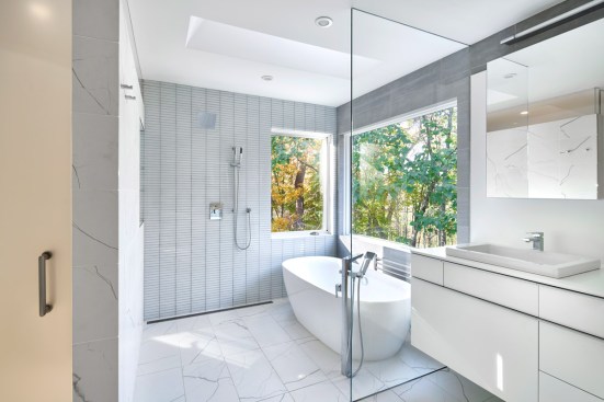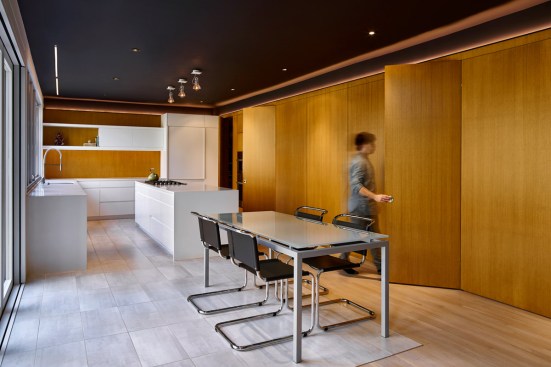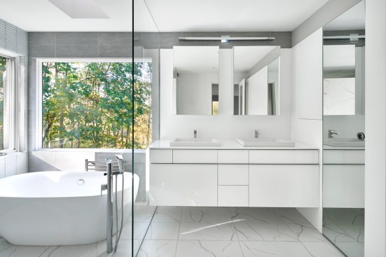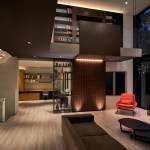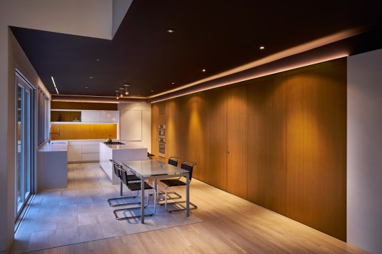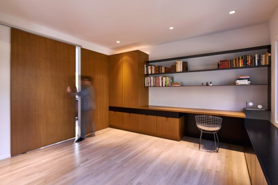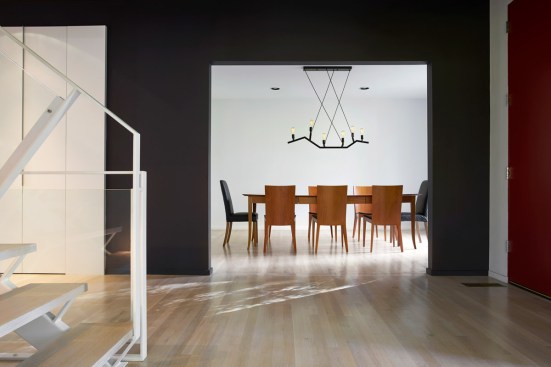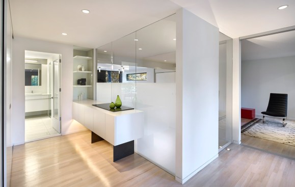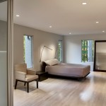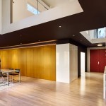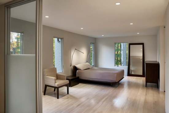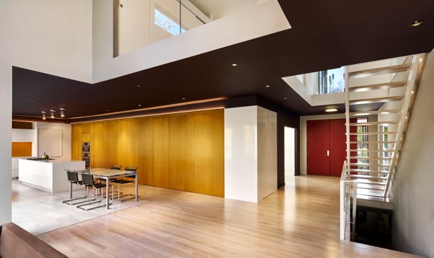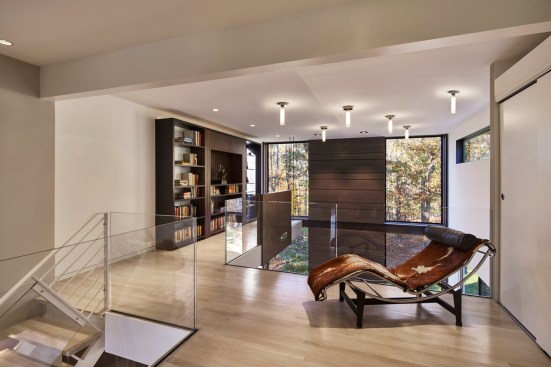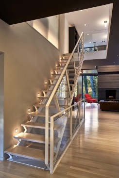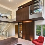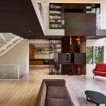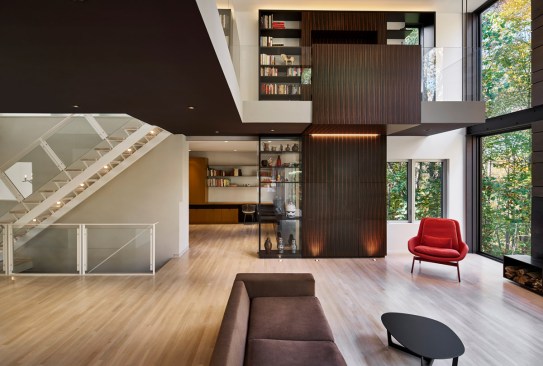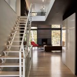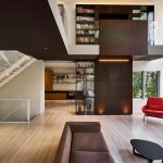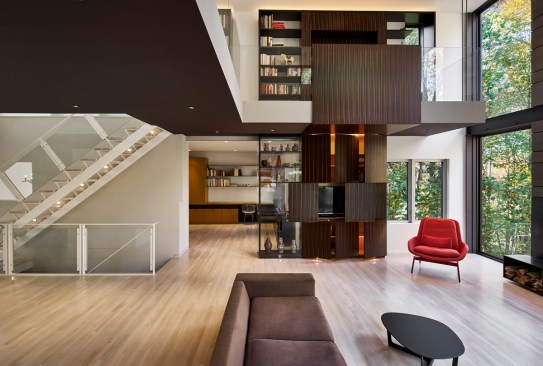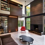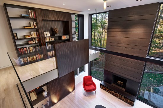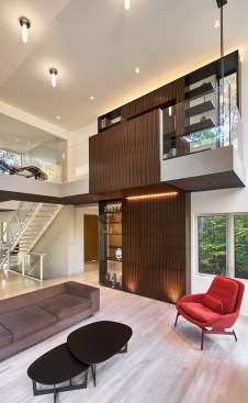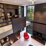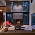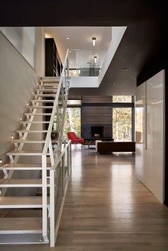 The goal for this existing suburban home was to “break open the box” to allow views of the surrounding wooded landscape. Interconnected spaces where created where previously there were walls dividing them. The kitchen and den are now opened up to the new family room, and the entry offers a view directly through the space to the trees beyond. The rear roof was raised in order to maximize views and light with large picture windows. Custom stained ash panels unify the various areas of the home. The family room’s vertical Macassar Ebony storage unit and viroc clad chimney add warmth and texture to the double height space. The exterior received a facelift which included new cladding (viroc and Hardi panel) and windows.