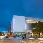Adjacent new construction replaces a former row house with a welcoming public lounge and two new state-of-the-art screening rooms. The striking pure white cube hovers above a transparent base to declare a vibrant new energy and dynamic future for the ever-evolving Parkway Theater.