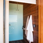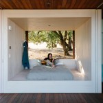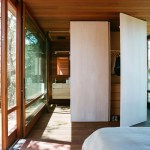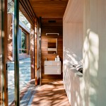 With such small footprints, not a single inch can be wasted. The main house features a whitewashed oak bed in the middle of the structures, with the frame forming the bedroom walls, and privacy screens pocket into the bathroom ceiling in lieu of traditional swinging doors. In the guest house, a built-in oak wardrobe serves as storage, and the wall of the bathroom. But throughout, the minimal palette is used to great effect. “I love the use of natural materials,” R. Michael Graham said.