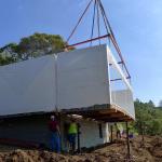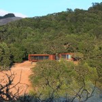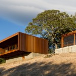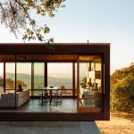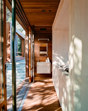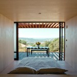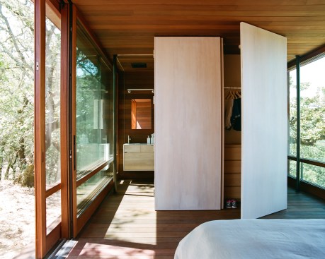 The structures were designed as part of Alchemy’s WeeHouse system of modular, prefabricated houses. The 640-square-foot main structure, which features an ipe-lined interior and a 9-foot-tall sliding glass door on either side, was assembled in Oregon in two parts: a 16-foot by 40-foot module and a bolt-on porch, which were each shipped to the site largely complete. The 330-square-foot guest house, a single unit, followed suit. The steel-framed modules were then set on concrete plinths on site, ready to occupy. The porch cantilevers out over the hillside, offering views of the valley below, and it was this striking profile that caught the attention of the jury. “It’s so tiny, but quite dramatic,” David Baker said.