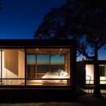 The Sonoma residence is a small, ultra-minimal modular home. It was custom designed by the project manager and the client, Apple’s Director of Store Design, an architect himself. Composed of two open sided boxes set on concrete plinths nestled on the edge of gnarled oaks, it meets the client's specific style and finishing requirements. The primary structure (640 SF) features a whitewashed oak bed box in the middle of the volume. An open kitchen/dining/living room is on one side, and a toilet and shower on the other. For shipping logistics, this structure was designed as two modules: the 16 ft. x 40 ft. main box, and a 10 ft. x 40 ft. bolt-on porch, which cantilevers into a dramatic landscape valley rich with vineyards, parklands, and the town of Santa Rosa. The accompanying guesthouse (330 SF), also shipped essentially complete, is an abridged version of the primary structure. A large whitewashed oak wardrobe forms the bathroom wall while providing adequate storage and privacy. Both structures feature steel frames, 9 ft. tall sliding glass walls that are set into custom corrugated weathering steel boxes, and ipe interiors with oiled oak cabinetry. Pocket doors recessed into the cabinetry close against the steel columns. Privacy screens are pocketed into the bathroom ceilings, with glass walls separating the toilet and showering facilities. In the main house, there is also a 25’ long drop-down insect screen pocketed into the ceiling.
