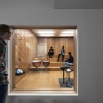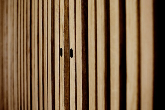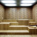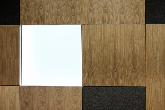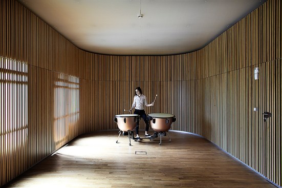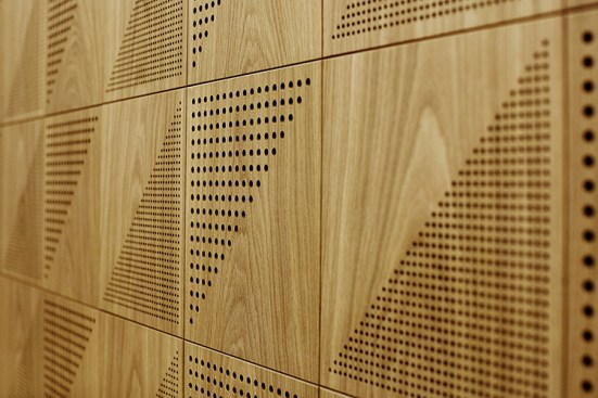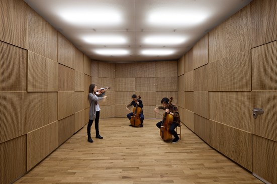 The four spaces are designed as spatial variations on the same aesthetic theme. Each of the spaces are clad in wood veneer, designed to meet and create the optimal acoustic setting for a specific instrumental group. From the vertical lamellae of the percussion space, the seemingly vibrating cassettes for strings to the graphical clarity of the brass space, the four spaces stands out as both contemporary modern and yet very classic in their expression – as a simple and precise continuation of the intended spirit in Vilhelm Lauritzen’s listed master piece.
