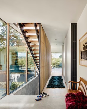 Siting the 2,990-square-foot home on the verdant lot was no easy feat: It sits on a 50-foot-wide infill lot, so the architects conceptualized a three-story volume that deftly negotiates the city’s zoning regulations—as well as the oak’s critical root zone—by suspending the main living space on two piers that nimbly avoid the tree’s roots. Visitors are greeted by a custom, slender gabion wall that gives way to evergreen plantings, and a perforated Corten corrugated screen to the south, designed to provide both privacy and animation to the home’s front façade.