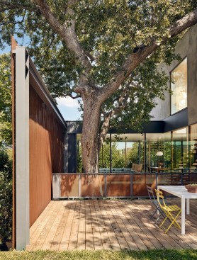 Fitting right into the array of eclectic bungalows that line the streets of Austin’s artistic Bouldin Creek neighborhood, the architecture of the South 5th Residence, designed by local firm Alterstudio Architecture, is a sculptural marvel in its own right; its glass box frame, accentuated by welded steel and tumbled limestone, unfolds effortlessly from a central courtyard shaded by a majestic, 25-foot-tall Durand oak.