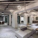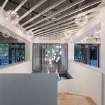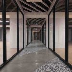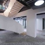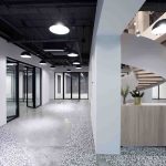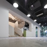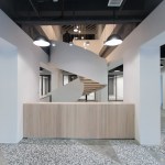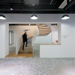 Designed by DYN Architecture, a hidden gem in the headquarters of Shanghai Garment Group (SGG), is a fashioned related co-working space located on Maotai Road, Changning District in Shanghai. In collaboration with SGG and Creater, the exisiting SGG building is transformed from a single-use office building to a modern co-working space mixed with retail, showroom, and office. Space Slice project aims to encourage interactions between different fashion departments and revitalise existing space. A four-floor co-working space with fashion related functions is inserted in the building. The existing SGG building is support by a number of wide concrete columns (800mm*400mm). How to use these densely placed columns to create a clean and continuous space became the challenge for architect. The disadvantage would be an advantage. “Why not to take the dimension of these columns to create something new?” The architect Yinian Dou came up with the idea of “slicing the space”: linking wide columns to form thick walls to divide the space. By opening up some walls and letting the space flow through, the spatial depth is created. Corresponding with the design of thick walls, a unique floor pattern of smooth concrete patches and small-size mosaics is also a creation from the architect: mosaics record the shadow of thick walls, and triangular concrete patches depict the openings. Ground floor is the reception: a customised white spiral stair is the central element brightening up the entrance space. Around the reception is stores, cafe, exhibition space, and bookstore. Following the spiral stair up, people arrive at the show space where fashion shows could be held regularly. Show related functions, such as showrooms, fabric storage, meeting space and offices are in close proximity to each other. More offices are provided on the second and third floors. Discards the black and grey colours which have been used for most of the co-working spaces in China, Space Slide project chose the opposite: the white. Elegant and unsophisticated, colour white emphasises the purity of space.