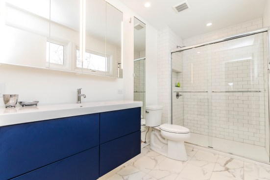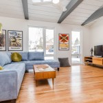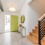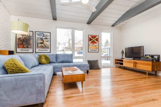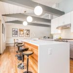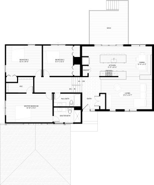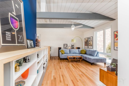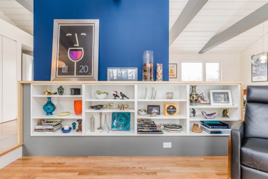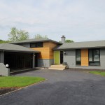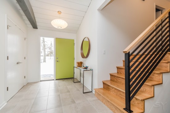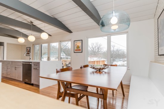 Our brave clients had just purchased this 1960's split-level when they approached us to help realize it's potential. Our clients were a recently engaged couple previously living independently. They sought to find a unique home to make their own. The house had very dark tones throughout and very little natural light or connection to the outdoors. The mid-century split-level was also conflicted in styles with a bay window, rustic brick, and a homogenous exterior that masked the unique forms that originally composed the curb appeal of the house. Our clients were luckily able to see beyond these detractions and they recognized with the right architect and builder, this home could be awesome! Our team first looked at the house for its unique positives: graceful vaulted ceilings with cedar-clad exposed beams, a relatively open layout, exposed brick walls, and an expansive lower family room space. We accentuated these characteristics that made the Owner's want to buy the home in the first place, while re-working the layout for a more modern use and feel. We extended the center partition to the ceiling and wrapped it with kitchen cabinets and family room built-ins, moved the entry closet to create a new entrance separation with new metal rail stairs, re-designed the window compositions, and added clear cedar accents both inside and out. To both spatially enlarge the kitchen and connect the spaces to the back deck, we added a 12’ wide double sliding glass door and continued a new window composition over the new built-in banquette. Open shelving divides the living spaces from the kitchen & dining spaces, and also creates a low horizontal focal point to juxtapose the grand vaulted ceilings. Additionally, we remodeled two baths, added a full bath in the basement, and refreshed the rest of the home throughout. with new flooring, paint, and windows. It was a significant whole-house remodel and the transformation is impossible not to notice…. in a good way!