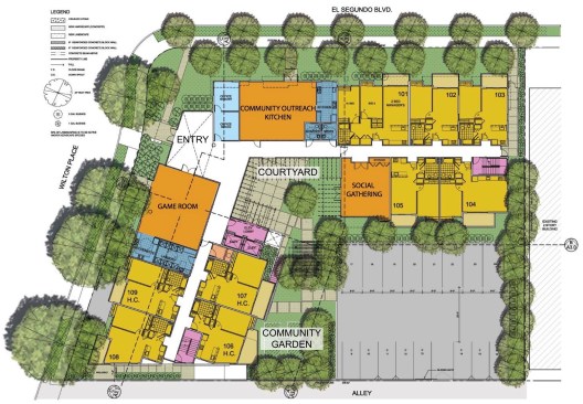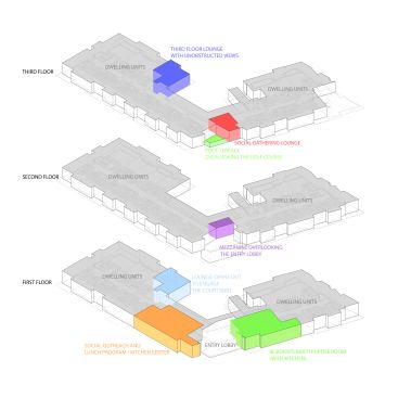 From the architects. CONCEPT The design of the 100% Low Income Affordable Senior Apartment Project addresses the special lifestyles of older residents, for the residents to feel that this is their home. Each unit entry door is recessed and the units are designed so that the residents can age in place. The Project includes a senior community room to accommodate a special outreach program for seniors living in the northern section of the City of Gardena. Serving as an extended Senior Citizen center, the project provides free lunches, senior day care services and a social service coordinator. SOCIAL The two-story entry lobby also serves as a lounge for the seniors so that the residents can sit at the front of the building and watch the activities of the street scene. The transparency of the exterior facades connects the lobby to the courtyard, a private social space with its shaded lanai. A resident communal garden is adjacent to the courtyard. Social gathering spaces are distributed so that each of the 3 floors has its own social space. The mezzanine on the second floor overlooks the entry lobby. The intent is to limit isolation and encourage social engagement. The laundry room is located adjacent to the elevator lobby to act as an extended social space. CONTEXT/NEIGHBORHOOD CHARACTERISTICS The project is an urban in-fill building among adjacent 1960’s period apartment buildings. The Chester Washington Golf Course with a community building and a public park is directly across the main street. The terrace on the third level provides views toward the golf course, and the lounge on the third floor has distant views over the adjacent residential neighborhoods. The property is within walking distance of convenience retail shopping and service providers and is linked to the larger community with public transportation with a bus stop in front of the building.