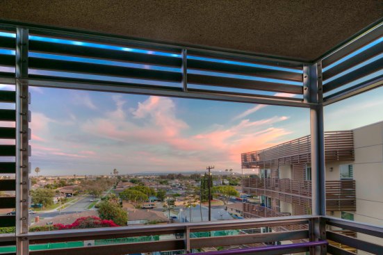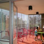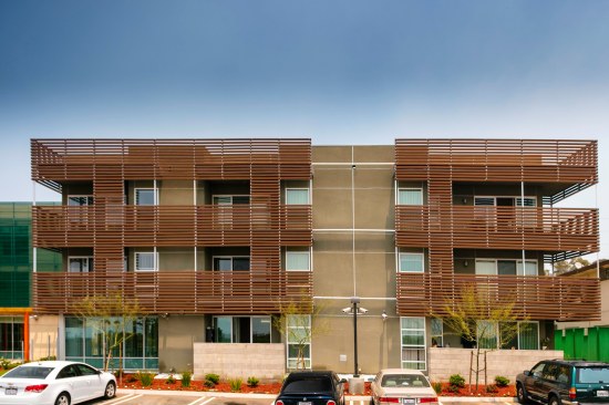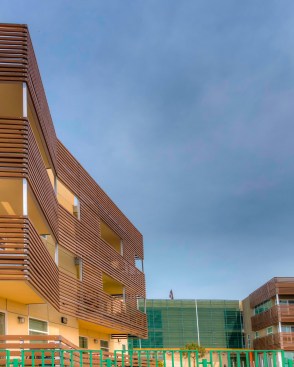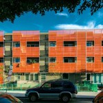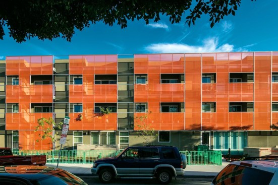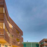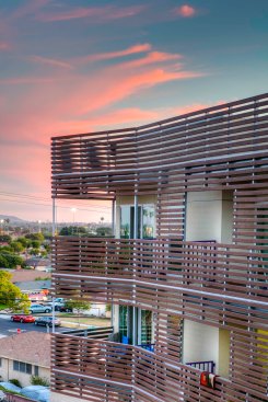 Outside, the largely transparent elevations give the structure a sense of lightness, and wood-and-metal screens prevent excessive heat gain. The wood slats shading residential areas vary in density based on the busyness of the corresponding street and perforated metal screens protect and highlight the translucent street and courtyard entries. The infill project fits more than 50,000 square feet of habitable space on a lot wedged among 1960s apartment buildings. Each unit also includes a small balcony with enough room to sit and watch the hustle and bustle of the surrounding urban neighborhood. — S.D.H.