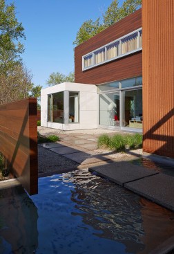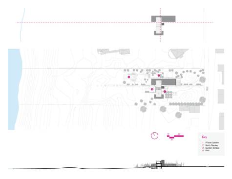 Secondary architectural elements are subsequently introduced, (trellis, screen wall, stepped garden, screened pavilion) extending the house into the landscape, and back. The resultant is a deliberate sequence of domesticated spaces of varied scales, each with specific agendas, microclimates, sounds, smells, effects.