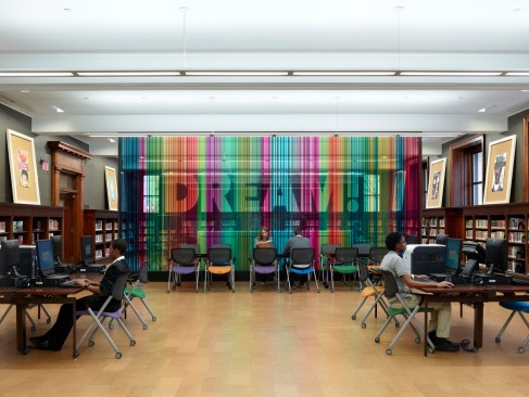 The North Wing truly ushers in the 21st century with the removal of old book stacks and the insertion of a newly constructed “building within the building.” A three story public atrium creates an accessible and welcoming entry, with new public spaces that include a 250-seat theater and teen rooms.